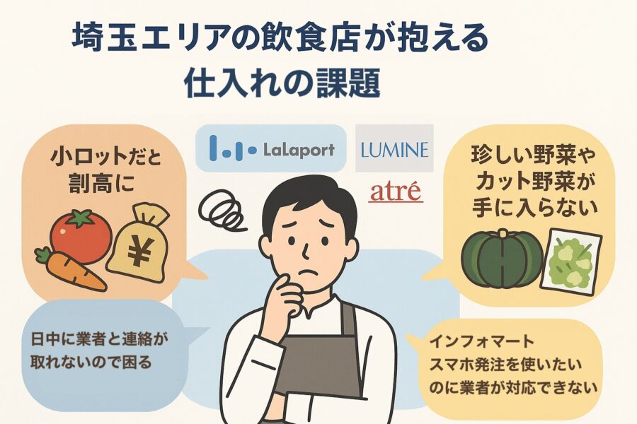 近年では、レイクタウン(越谷)、グランエミオ所沢、コクーンシティ(さいたま新都心)など大型ショッピングモール内の飲食店やテイクアウト業態も増加中。一方で、仕入れ体制が整わずに「いい業者が見つからない」「配送してくれない」といった課題を抱える声も目立ちます。