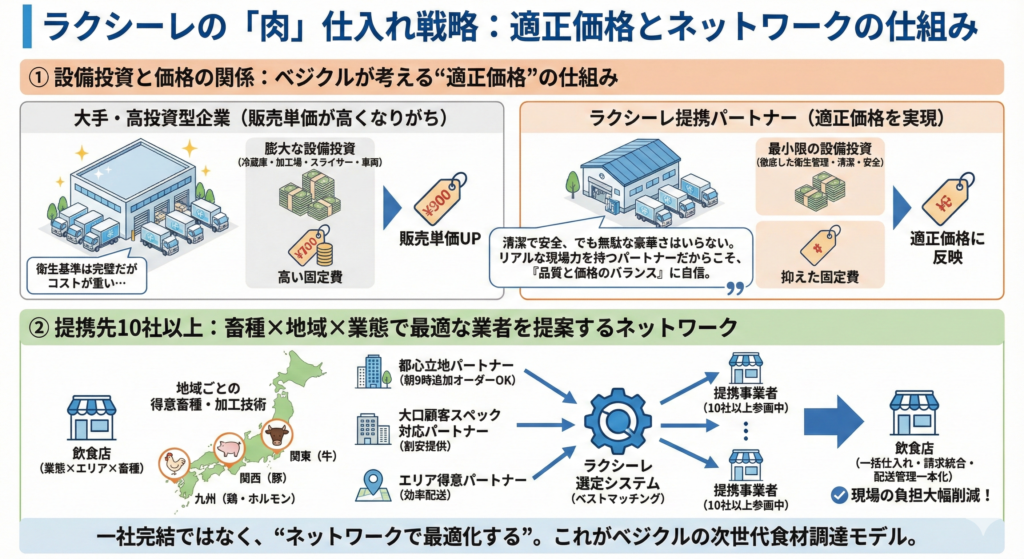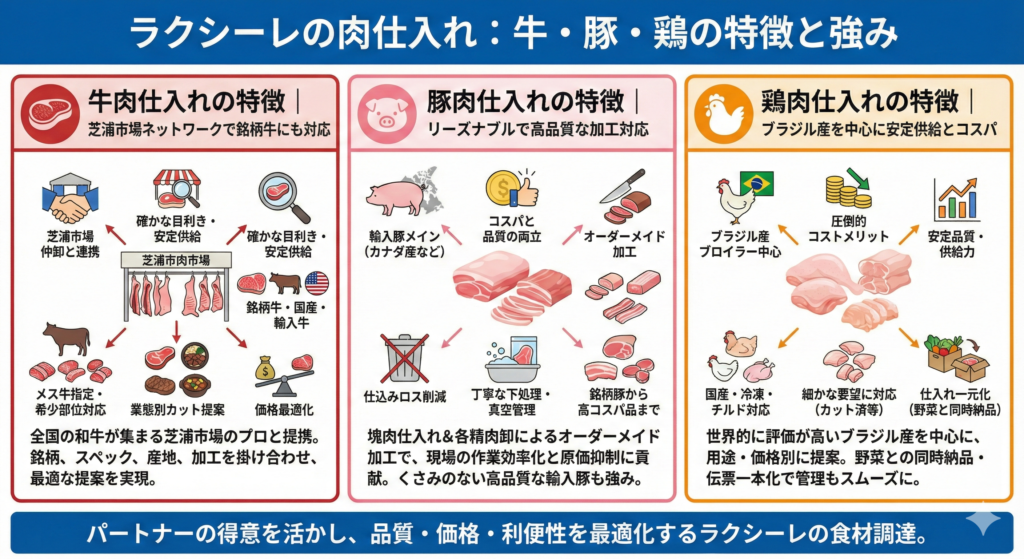 「牛・豚・鶏を別ルートで仕入れていた店舗が、ラクシーレ一括で完結」するようになります。