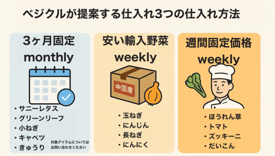 ベジクルでは、こうした相場の波を前提としながら、飲食店向けに3つの提案を行っています: