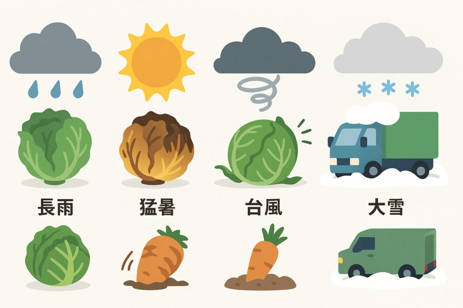 ・台風・大雪 → 作物の倒伏、物流の遅延