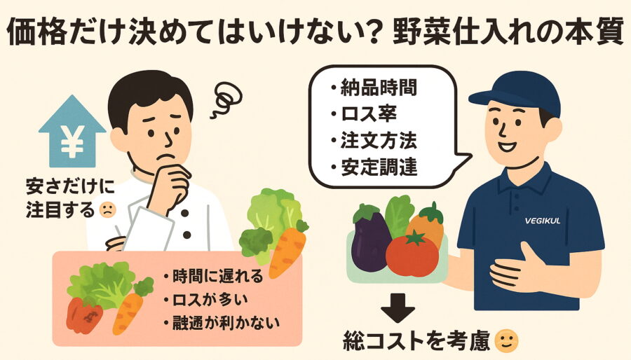 ベジクルでは、「仕入れ価格」ではなく「仕入れ体験の総コスト」で業者選びを考えるべきだと考えています。