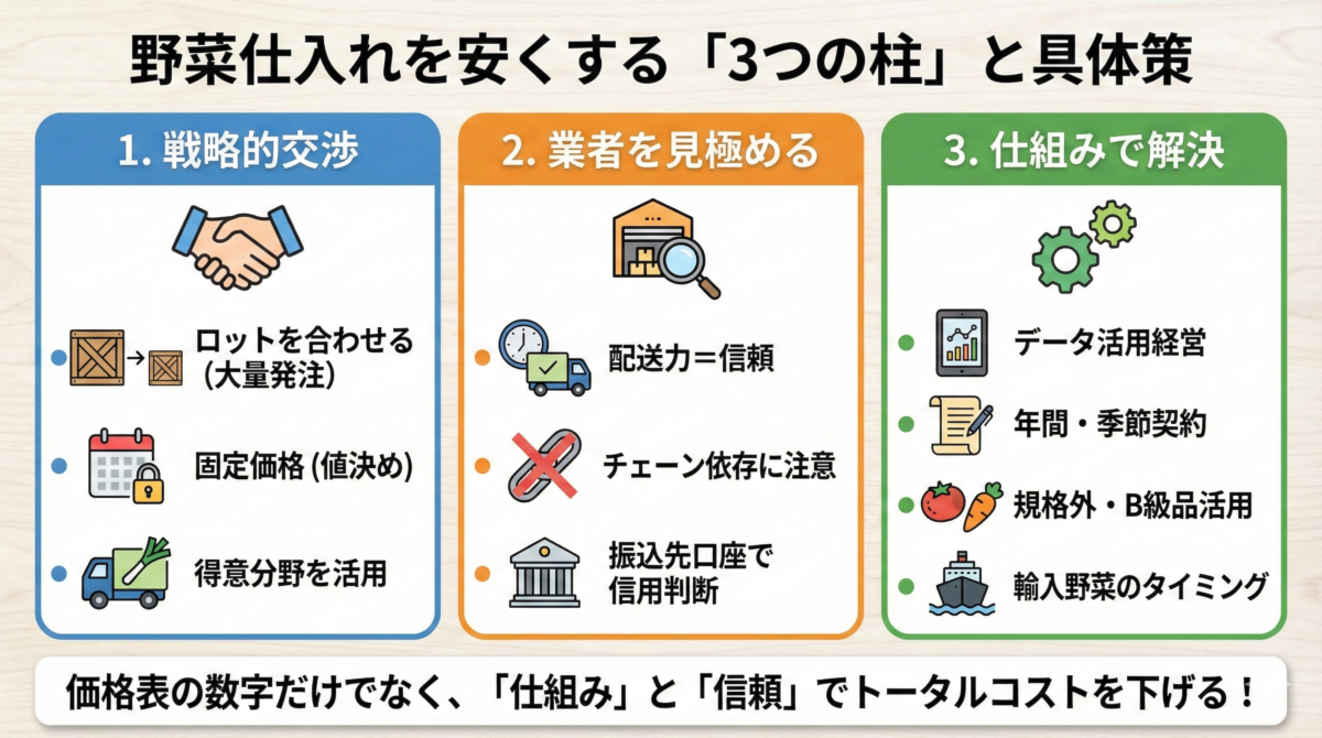 おすすめは、価格が荒れやすい野菜だけ“契約仕入れ”に切り替えること。
