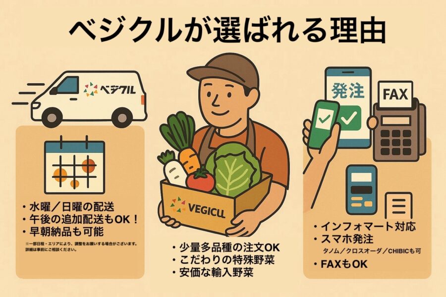 また、ベジクルのような野菜専門の業務用卸では、市場に流通しにくいB・C級品や産直の規格外野菜を一定量確保しており、飲食店や食品製造業者向けにデジタル発注に対応した定期供給も可能です。安定的に、かつ柔軟に使える仕入れチャネルとして、近年注目が高まっています。