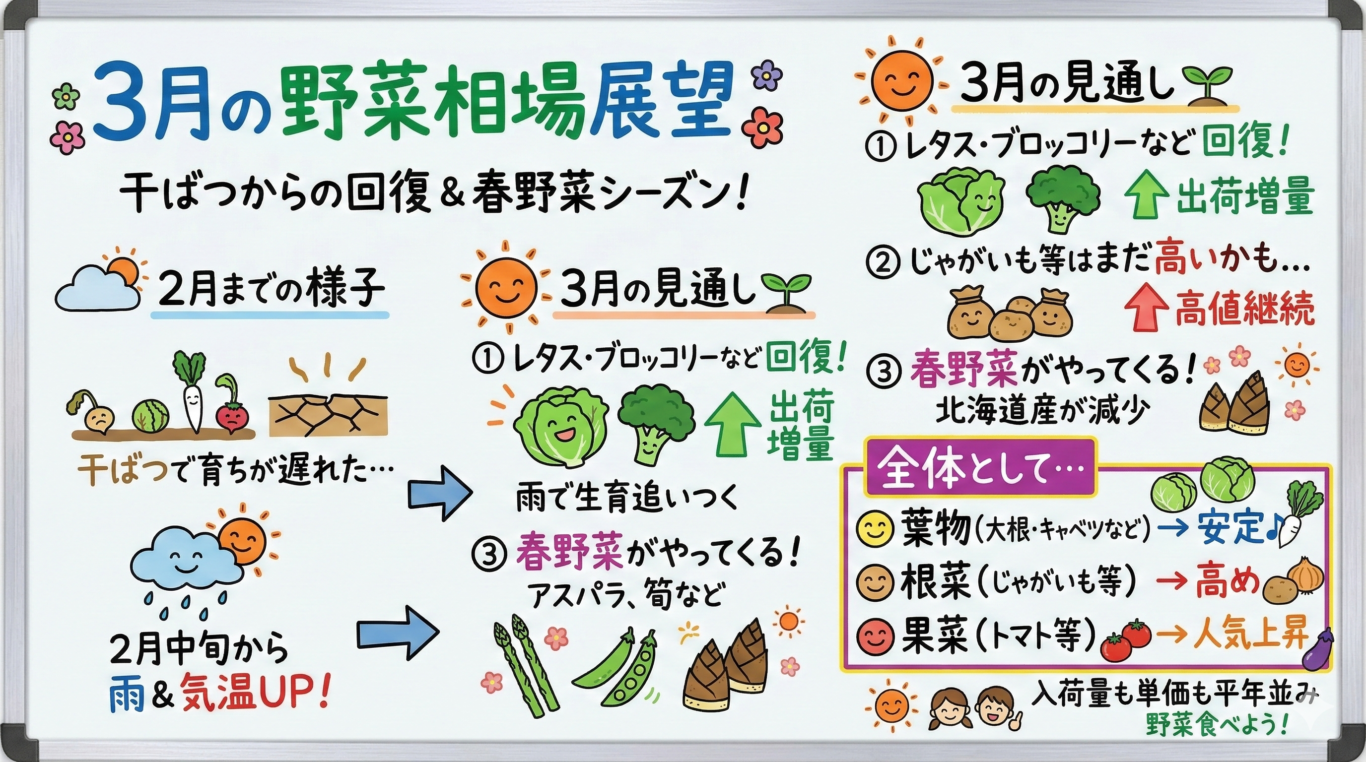 2月は全国的に干ばつ傾向が続き、生育遅れや品質低下が多くの野菜で見られましたが、中旬以降の降雨と気温上昇で徐々に生育が回復しつつあります。