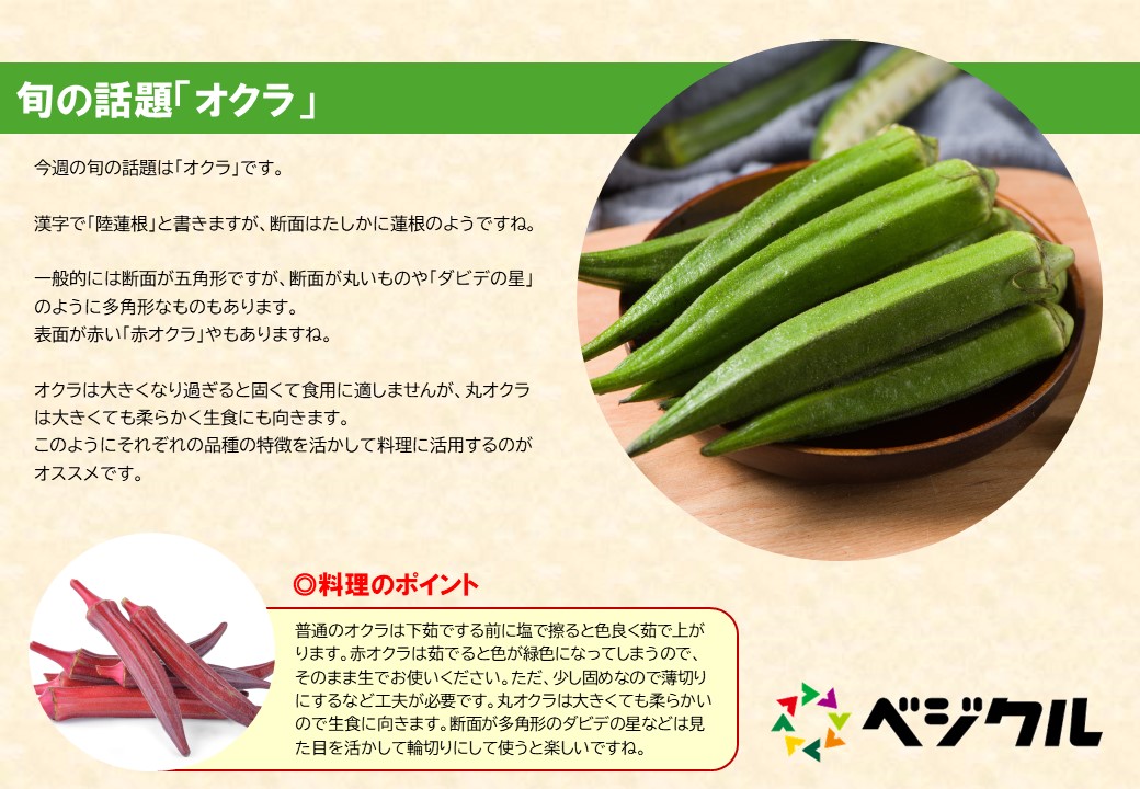 赤オクラは茹でると色が緑色になるので、色味を活かすのであれば生食がオススメ。少し固いので薄切りにして使うと彩りとしても使いやすいですね。
